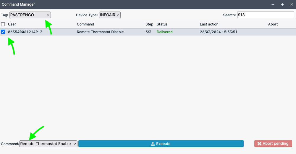 If you have multiple heaters, you can simplify the search by selecting the appropriate ‘Tag’ (i.e., group) and using the ‘search’ textbox. Then select the heater(s) and from the drop down menu choose “Remote Thermostat Enable”, then click “Execute”.