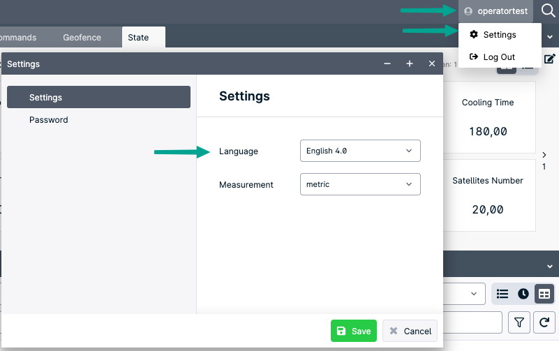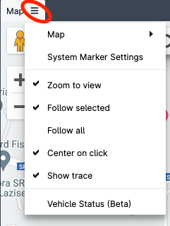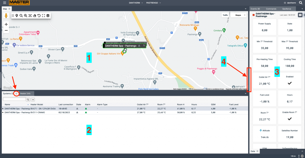 (1) Map area with all the available systems in the current view. Each system is located in the last known position and with its status indicators.