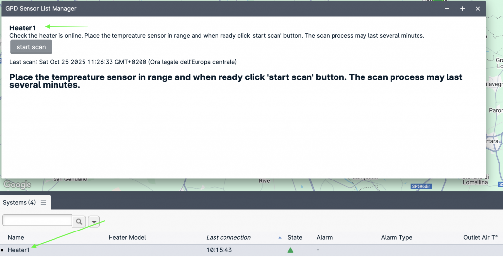 Click “start scan” and wait for the device to be listed. The can process can require up to two minutes. If no sensor is listed check the sensor is active and in range and if needed restart the scan process.